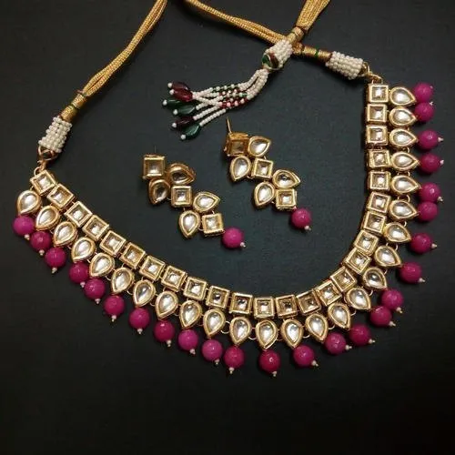This stunning jewellery set captures the essence of traditional Indian craftsmanship through the intricate beauty of kundan work. The necklace features a graceful arrangement of gold-toned square and teardrop elements, each embedded with luminous white stones. Accented by alternating pink beads and teardrop pearls, it evokes a regal charm perfect for weddings and festive occasions.