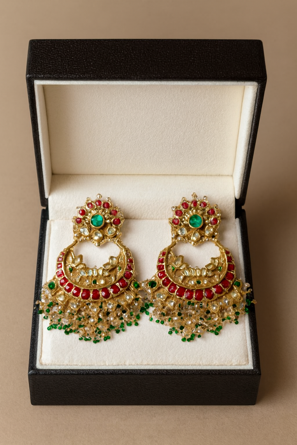 The Earrings are a celebration of timeless artistry and cultural elegance. Crafted in radiant gold, these earrings feature a stunning blend of red, green, and white gemstones that capture the vibrancy of festive traditions. The upper floral motif, centered with a lush green stone and encircled by sparkling white accents, symbolizes prosperity and grace.