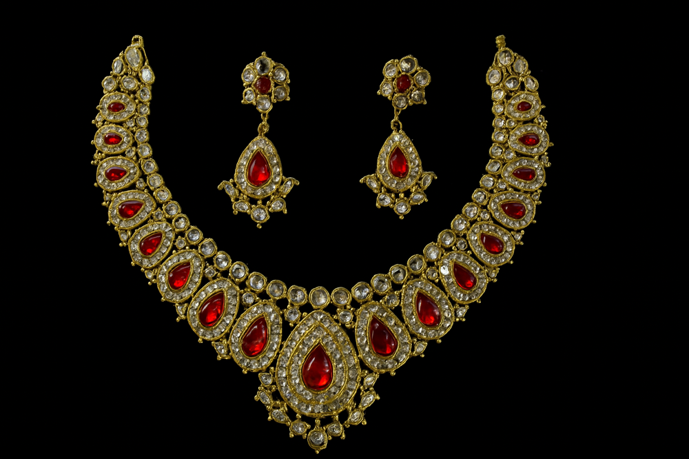 The necklace showcases a symmetrical arrangement of floral and teardrop motifs, bordered with shimmering clear stones that enhance its brilliance and add a touch of luxury. Each red gemstone is framed in intricate detailing, creating a striking contrast that highlights the artistry and heritage behind the design. The matching earrings mirror the necklace’s pattern, completing the set with perfect harmony and grace.