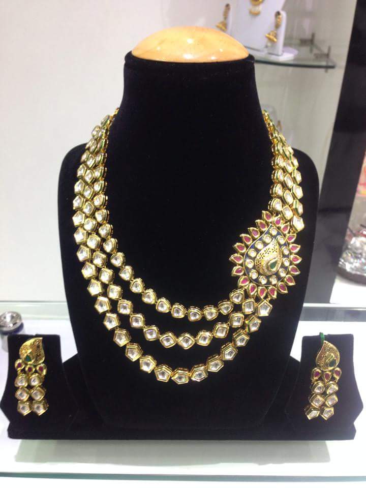 Matching earrings echo the necklaceโ€™s brilliance, with white stones and red accents that complete the ensemble in perfect harmony. This set embodies ceremonial grandeur and cultural heritage, making it an ideal choice for weddings, festive occasions, and timeless heirloom collections.