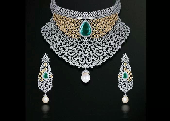 Extending gracefully below the emerald, the necklace unfolds into a lace-like silver design, showcasing masterful craftsmanship and culminating in a luminous pearl drop. The pearl, a symbol of purity and grace, adds a soft glow that enhances the grandeur of the set.