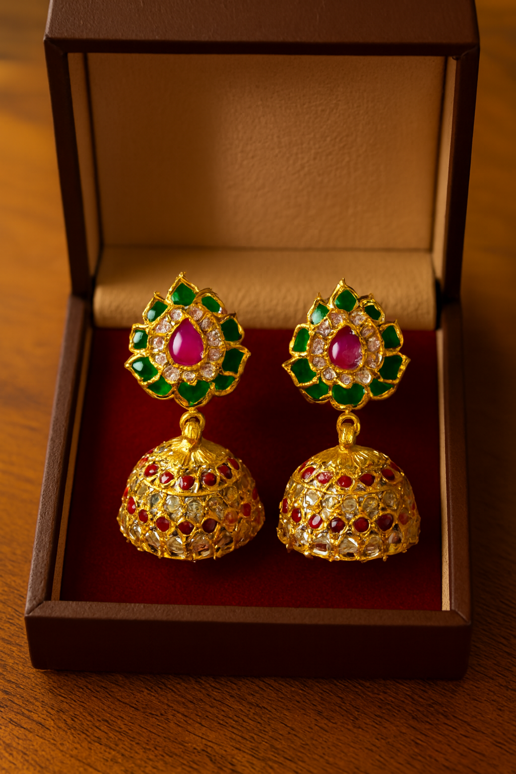 The Pushpanjali Jhumka is a radiant tribute to tradition, inspired by the grace of blossoms. The upper motif features green petals encircling a central ruby teardrop, bordered with delicate white stones that shimmer with purity. The lower bell-shaped lattice is crafted in gold, adorned with red and white gems, creating a harmonious balance of color and brilliance.
