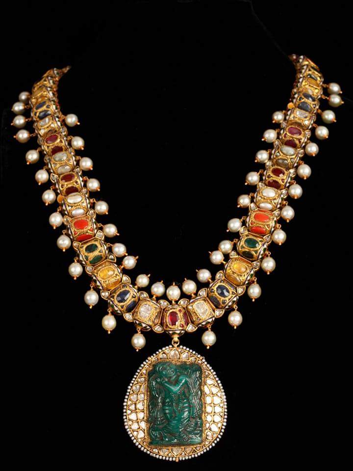 At its heart lies a striking carved green gemstone pendant, depicting two figures in an embraceโa vision of artistry and tradition framed in gold and surrounded by radiant white stones. This centerpiece transforms the necklace into a narrative jewel, blending luxury with cultural resonance. Perfect for weddings, royal occasions, and festive gatherings, the Rajdarshan Necklace is more than adornmentโit is a vision of heritage, a statement of splendor, and an heirloom of timeless beauty.