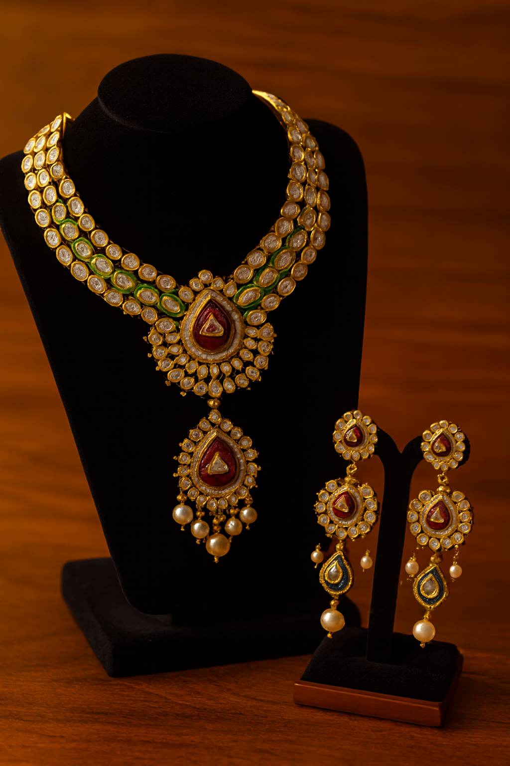 The Rajmala Ensemble is a tribute to royal heritage and traditional artistry. This ornate set features a crescent-shaped necklace adorned with alternating rows of oval-cut white stones and green enamel accents, culminating in a majestic teardrop pendant. The pendant showcases a deep vermilion centerpiece framed by shimmering stones and delicate pearl drops, adding movement and grace.