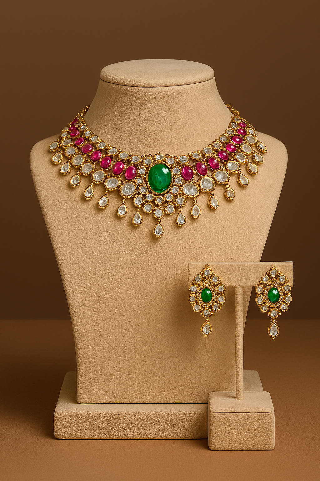 ounted on a velvet bust and earring stand, the setโs presentation highlights its intricate detailing and luxurious finish. The warm tones of the velvet and soft lighting accentuate the richness of the gemstones and the finesse of the gold-toned metalwork, making it a perfect centrepiece for bridal catalogues, festive campaigns, or premium jewellery collections.