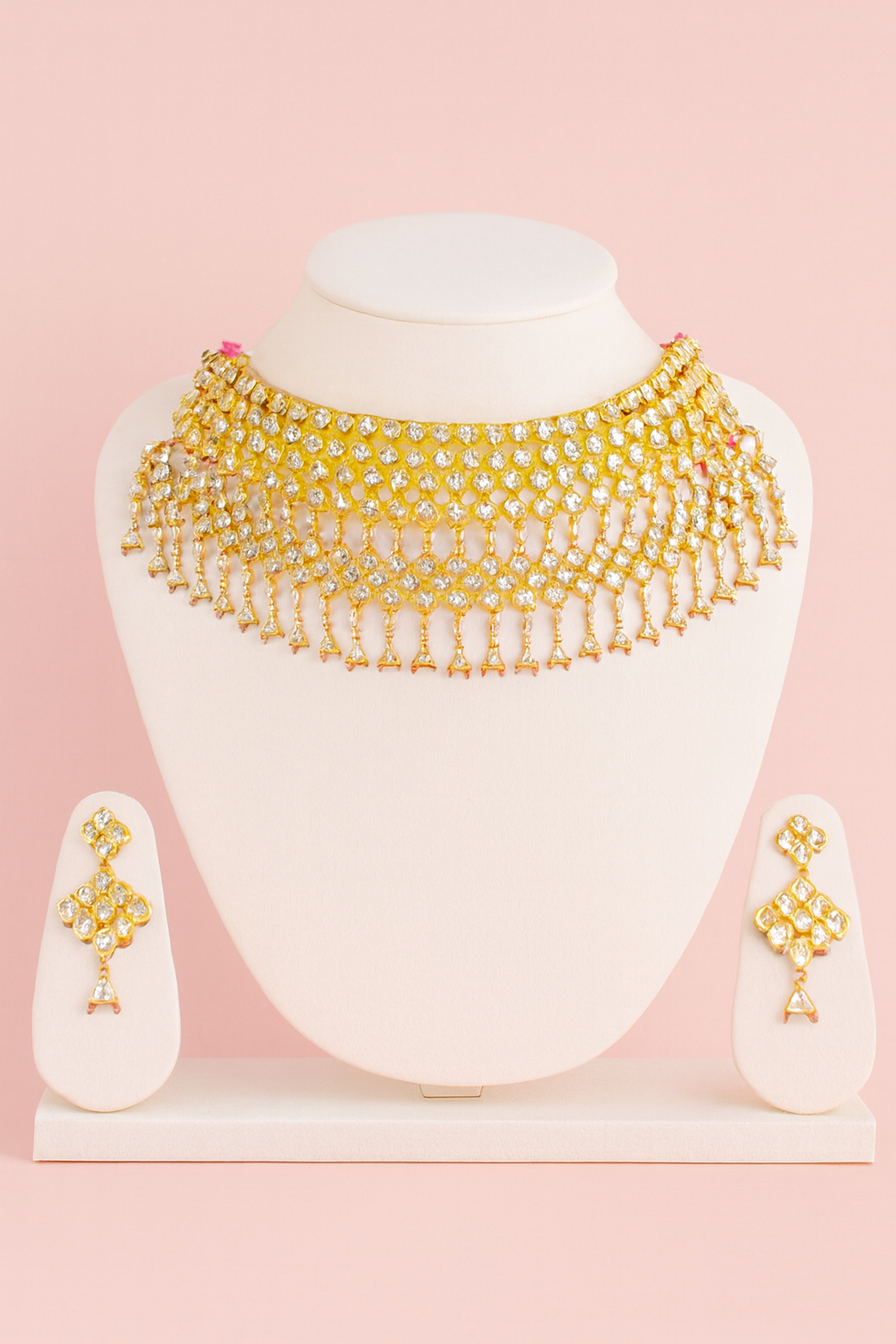 The matching earrings mirror the necklaceโs elegance, with tiered diamond-shaped patterns and delicate dangling elements that complete the ensemble. Together, they form a striking set that radiates ceremonial opulence and timeless beauty.