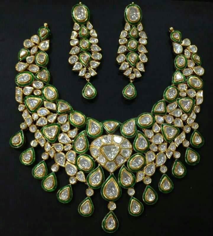 The necklace cascades into a fringe of dangling teardrop stones, adding movement and brilliance to the piece. The green enamel accents evoke freshness and prosperity, while the gold detailing lends warmth and grandeur. Every element is meticulously placed to reflect the sparkle of starsโhence the name Sitara, meaning โstar.โ